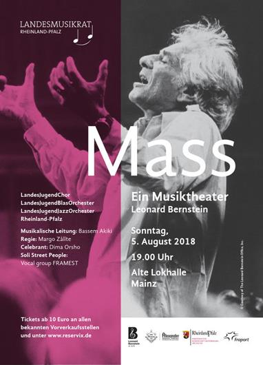 Am 5. August bringen drei der fünf beim Landesmusikrat Rheinland-Pfalz angesiedelten Landesjugendensembles im Rahmen eines singulären Gemeinschaftsprojekts mit der „Mass“ des großen US-amerikanischen Komponisten und Dirigenten Leonard Bernstein, dessen einhundertjähriger Geburtstag 2018 weltweit gefeiert wird, eines der Konzert-Highlights des laufenden Jahres in der Alten Lokhalle in Mainz zur Aufführung.